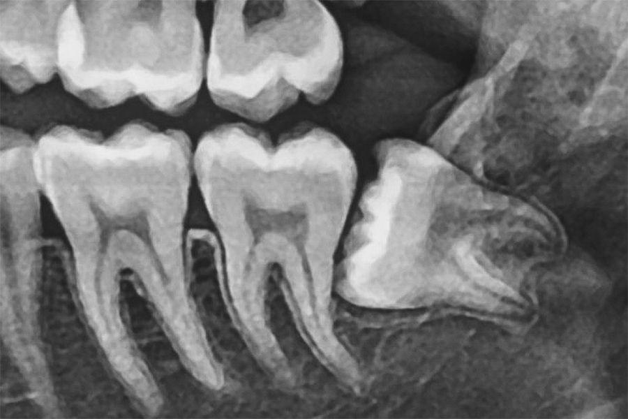 横向きに生えている「水平埋伏歯」は、手前の歯を圧迫し、痛みや歯並びの乱れ、虫歯・歯周病の原因となることがあります。