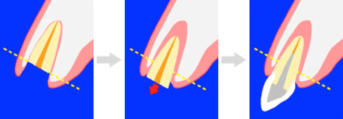 この治療法では、歯ぐきや歯を支える骨の一部を下げることにより、歯の根の部分を外側に露出させます。こうすることで、被せ物をしっかり装着できるだけの歯の高さを確保します。