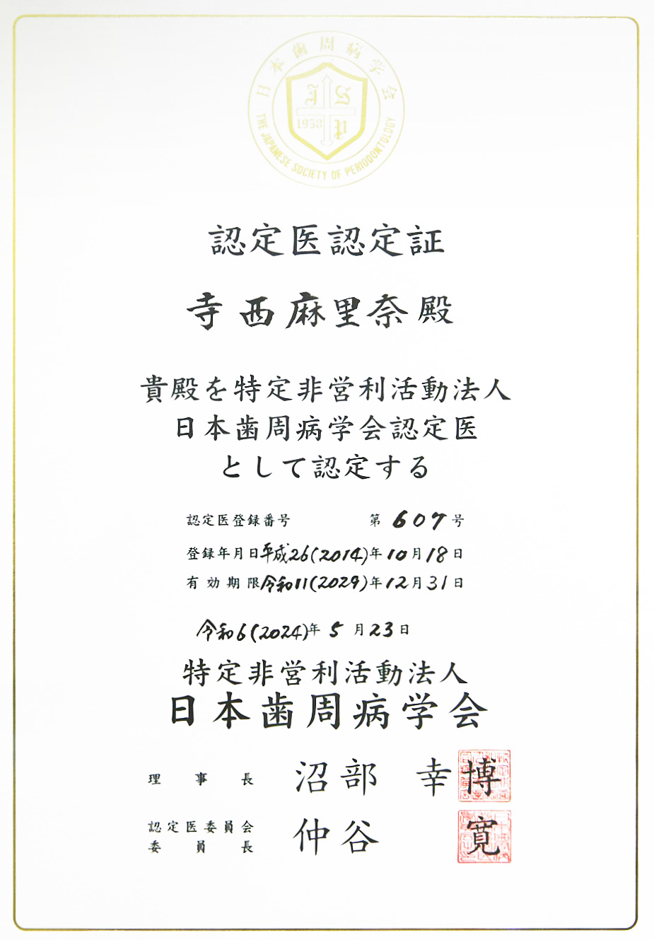 日本歯周病学会「認定医」